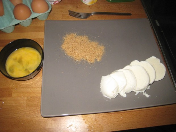 Tu casses ton œuf dans un bol et tu le bats ( non, il n’a pas mal, ne crains rien), coupe ta boule de mozzarella en lamelle. Tu verses de la chapelure dans une assiette. Trempe ensuite tes lamelles de mozzarella dans l’œuf battu et roule les dans la chapelure.