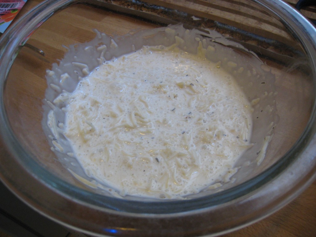 Mélange dans un saladier ta crème fraiche avec sel, poivre, noix de muscade, herbe de Provence et fromage râpé.