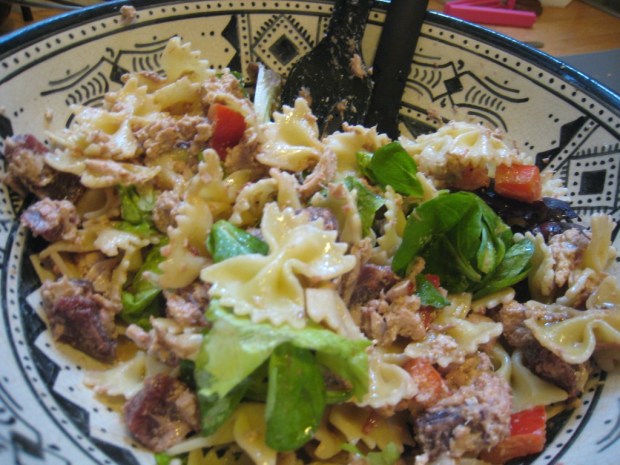 Laisse surtout bien refroidir tes pâtes ( que tu auras cuites al dente pour plus de goût), puis ajoute les au reste. N’hésite pas à rajouter un peu d’huile, de vinaigre, de sel et de poivre, et ajoutes tes pignons de pain ( amandes effilées) :
