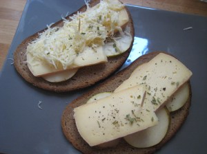 Il te faudra du pain Poilâne, de préférence. Je n’en avais pas, j’ai donc utilisé du Pain de Seigle ( très bon aussi). Une poire conférence, une portion de saint nectaire, du fromage râpé, du poivre et du basilic.