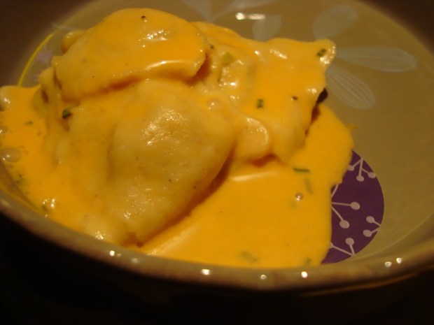 Raviolis de légumes aux 7 légumes blé complet Casino / avec une sauce au potage de tomate liebig – lait de coco -Ciboulette- Sel -Poivre.