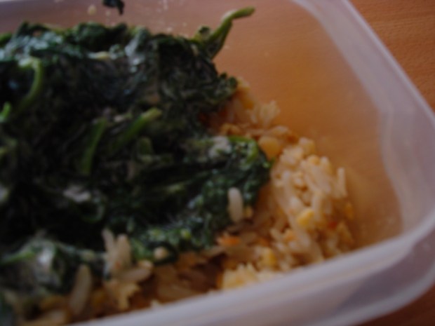 Mélange bio de riz, lentille, soja Carrefour / Épinards à la sauce crème fraiche et fromage Philadelphia / Sel / Poivre / Coriandre