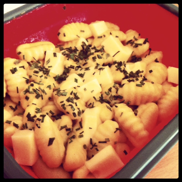 Gnocchis de pomme de terre, mon fonds de potage liebig aux légumes, dés d’emmental, sel, poivre, ciboulette.