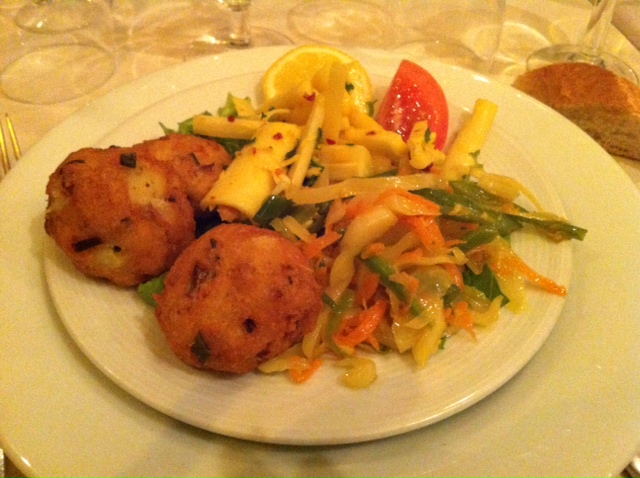 Et alors, qu’est ce qu’on mange ? Pour commencer on a eu le droit à un cocktail plutôt bon. Le menu que nous avions ( 22€ car négocié by the king of the night) comprenait une entrée avec des spécialités variées, et pour les végétariens : 3 accras de morue, un achard de légumes et des morceaux de palmier (et qui est annoncé comme une salade de palmiste mais qui n’en est pas selon la source WikiJason). J’ai bien aimé sauf les petites arrêtes dans mes accras, m’enfin c’était vraiment vraiment savoureux! … J’ai beaucoup aimé l’achard de légumes, et ai même mangé celui de ma voisine de table (qui a dit bouffe tout?).