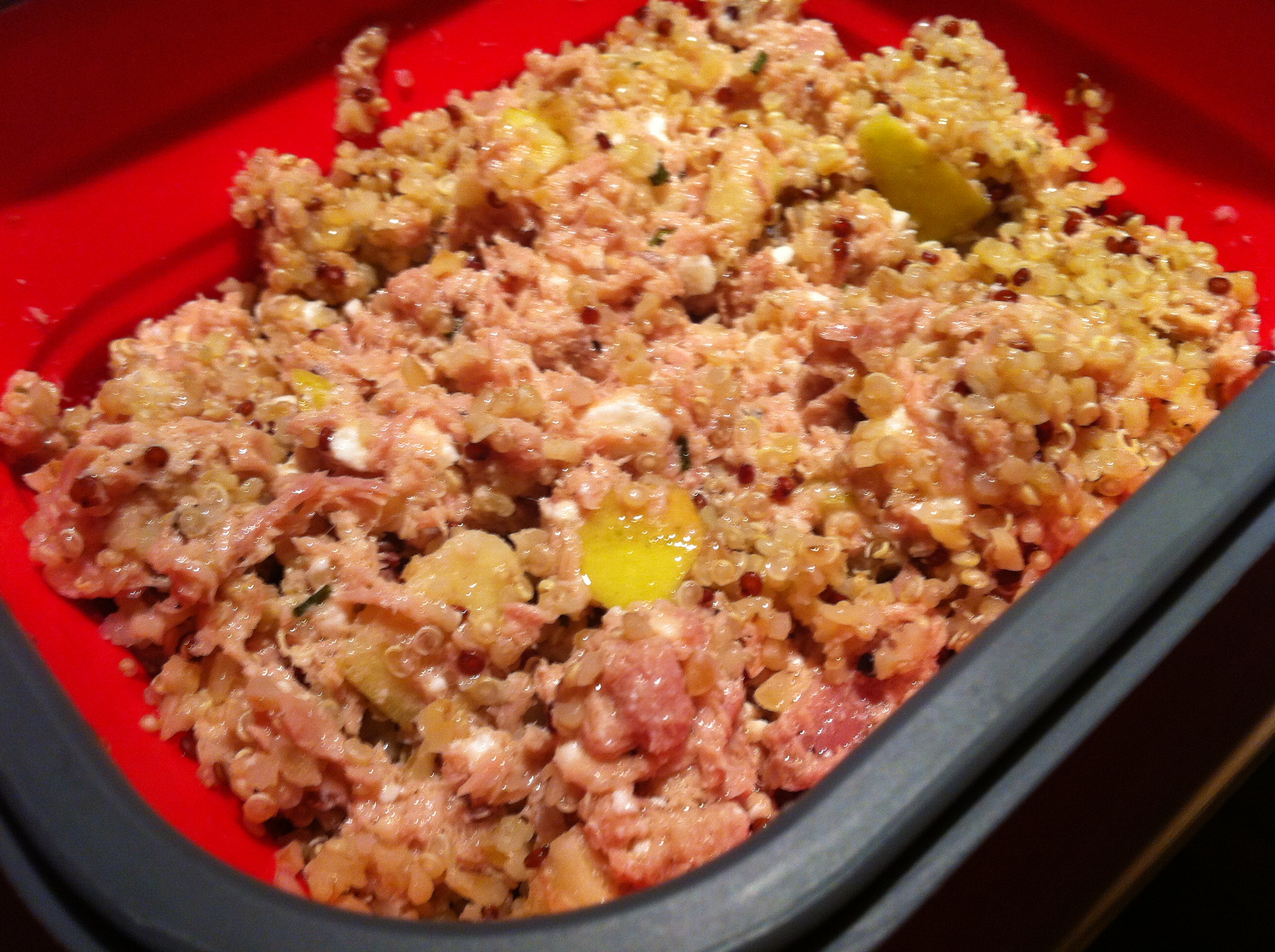 quinoa mélangé à une préparation de thon émietté à l’huile d’olive / Fêta  / tout petits morceaux de Pomme golden / Ciboulette/ Poivre – à servir fraiche.