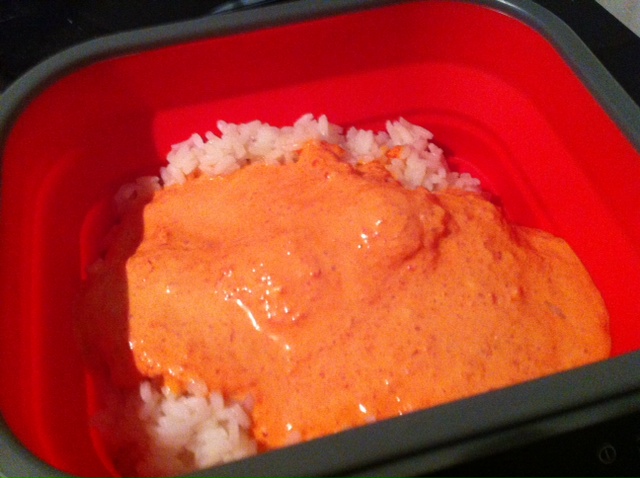 Sauce à base de petits morceaux de Poivron rouge mixés avec de la mascarpone / Sel / Poivre / accompagnant du riz blanc