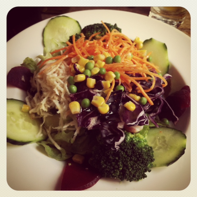 A la carte des plats simples mais efficaces comme Hachis Parmentier de canard, carpaccio et son gratin dauphinois, des salades, le tout pour des prix très raisonnables. J’ai pris une salade végétarienne qui manquait certes un peu d’imagination et de couleur, mais a glissé toute seule( 7€). Les autres convives ont été ravis de leurs plats.