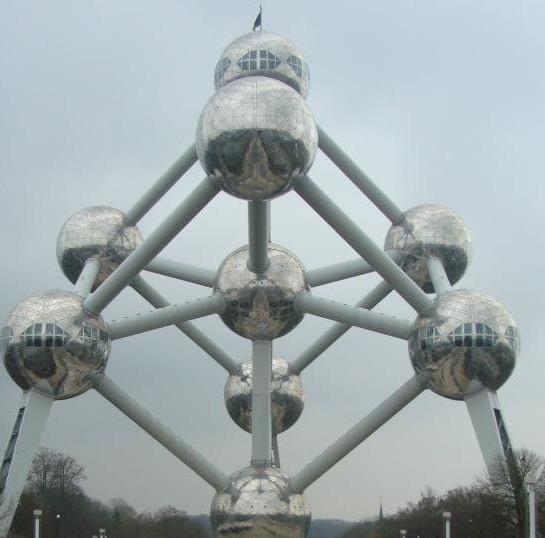 Sur les trois fois où je me suis rendue à Bruxelles, j’ai visité l’Atomium deux fois. Un batiment étrange construit pour l’exposition universelle de 1958, représentant la maille conventionnelle du cristal de fer  (phase cubique centré) agrandie 165 milliards de fois. Ca vous donne un monument aux formes rondes, impressionnant de l’extérieur comme de l’intérieur. Les escalators étroits et à pic vous donneront sans doute le vertige, mais du haut des 102 mètres, on domine toute la région, et le panorama vaut le coup d’oeil.