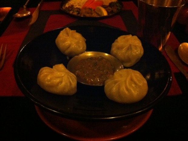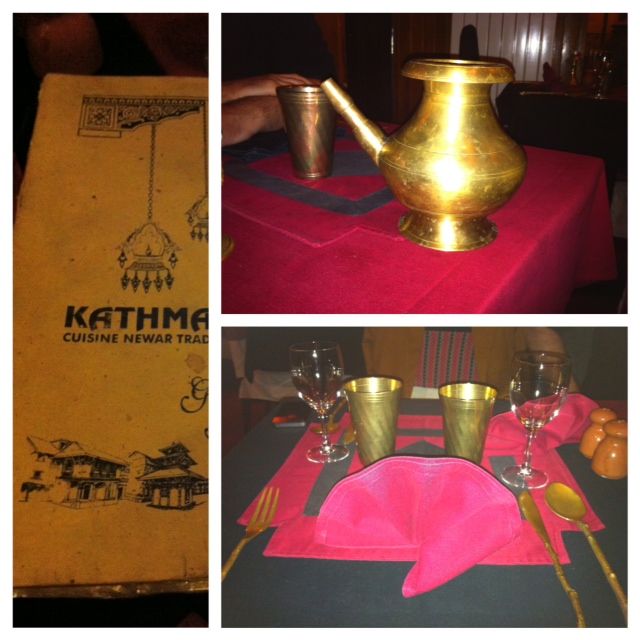 Curieuse de cette cuisine, je me suis rendue au Métro Jussieu, pour découvrir le restaurant Kathmandu, spécialisé dans la gastronomie Népalaise. J’ai passé une soirée très agréable, notamment grâce à un patron très sympathique qui nous a fait voyager de Paris jusqu’au Népal. La devanture très noire, présentant les plats par des photos ne m’aurait pas interpellée si je n’avais pas décidé d’y dîner.  En revanche la décoration intérieure, en lambris,  en noir, et en rouge, avec des masques traditionnels au mur m’a séduite. Et si l’on a une impression d’obscurité en entrant, on se fait très vite à l’endroit ( par contre, le bémol c’est que mes photos sont très sombres!).