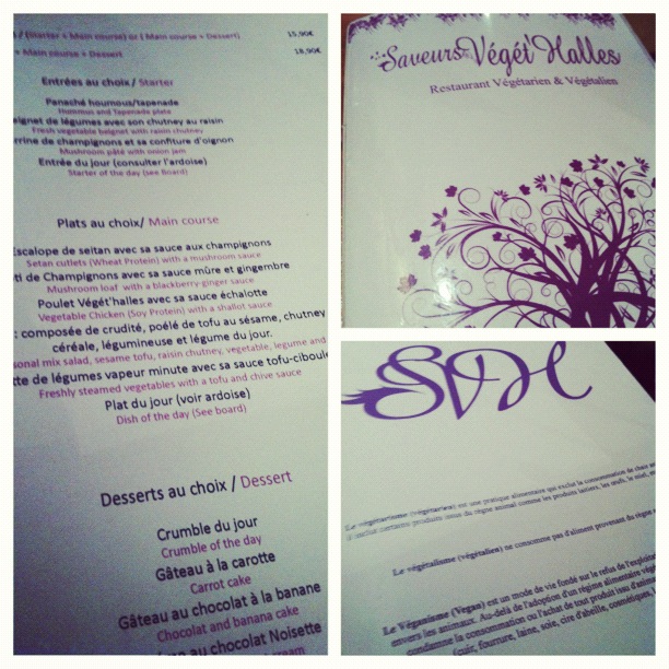 Je me suis rendue compte que la folie Végan avait atteint Paris, il y a désormais pas mal de choix pour les non carnivores, les végé Friendly et les hypster-bobos-écolos parisiens. Désormais, il est possible de manger végétarien dans beaucoup d’endroits, et je suis en train de les découvrir, pas à pas. Il m’a été proposé de découvrir le restaurant Saveurs Végét’Halles, niché à Chatelet. Celui-ci est très agréable, grâce à une décoration sobre et verte, et des plantes un peu partout. Et la carte m’alléchait vivement avant même d’entrer dans le vif du sujet. J’ai d’ailleurs bien aimé qu’ils expliquent dans la carte la différence entre Végétarien et végétalien car beaucoup ne la font pas encore.