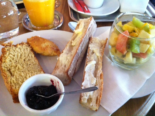 Sucré : Une part de cake au citron, une madeleine et deux tartines beurrées, avec une salade de fruits toute fraîche, le tout accompagné de confiture.