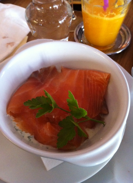 Salé : Une mini pizza, pas si mini ! (on peut aussi opter pour la version sucrée)  et un oeuf cocotte saumon ou chorizo ( j’ai choisi saumon).