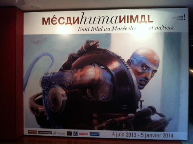 1Lors de la Nuit des Musées 2013, j’ai eu l’occasion de redécouvrir le Musée des arts et métiers, musée par excellence de l’évolution des techniques, et riche de machines en tous genres. J’ai ainsi eu vent de l’exposition temporaire qui commençait le 4 Juin «  Mécanhumanimal  » présentant à travers les oeuvres d’Enki Bilal, le  patrimoine scientifique et technique du Musée des arts et métiers. Enki Bilal est un formidable auteur de BD, que j’ai connu par le biais de quelques images qui m’ont marquées car visionnaires et poétiques. J’aime particulièrement sa manière de dessiner le corps de la femme, qu’il sublime.