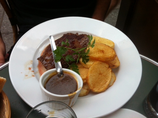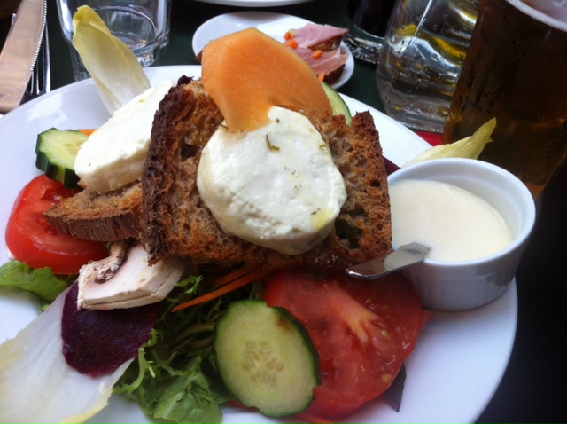 On se retrouve dans les agréables rues du Marais, à déambuler, quand une faim nous prend à hauteur de la rue vieille du temple, au 28 même, pour être précis. Alors, on déniche une terrasse, et deux places sur celle-ci, on s’installe, on est bien. A la carte il y a du choix, pour tous les appétits et tous les régimes. Mon convive invite à notre table le plat du jour : la bavette d’Aloyau (12€), tandis que j’opte pour une salade de crudités au chèvre chaud sur des toasts de délicieux pain Poilâne(11€). J’arrose le tout d’une pinte d’Amstel, il faut bien faire glisser (7€). Tout est bon et assez copieux pour nous ravir, d’autant plus que l’on sait où sont fabriqués les produits. Ici, ils sont cuisinés dans la cuisine, et avec beaucoup d’amour.
