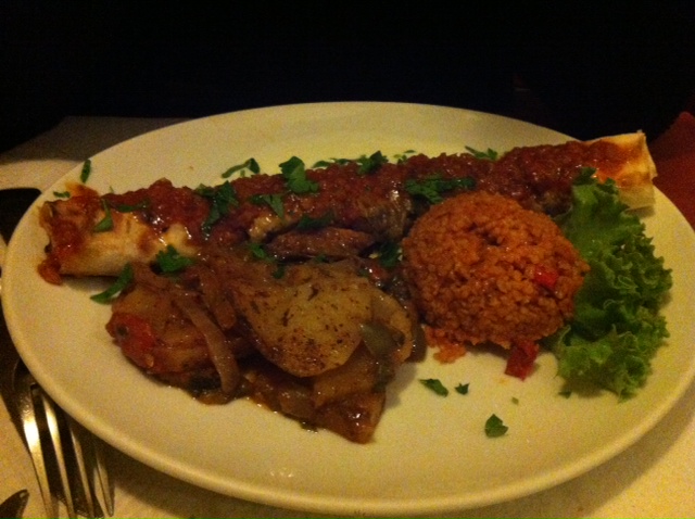Le Dilan est un restaurant Kurde reconnu depuis 15 ans, qui s’est taillé une solide réputation. Nous avons commencé par une entrée composée de feuilletés à la Feta ( Borek ) à 7€. Un délice ! Je les ai trouvé à la fois légers et savoureux. Ensuite  j’ai opté pour un plat végétarien, le Seleta Male qui se compose d’aubergines, de courgettes, poivrons rouges, roquettes et mozzarella ( 11,50€). C’était très léger et pourtant copieux, les légumes sont peut être un poil trop huileux mais c’est tout de même délicieux. J’ai passé un excellent moment avec mon assiette, sans compter le pain qu’on mangerait sans faim ! Je ne me rappelle pas de l’autre plat de viande, mais c’était une sorte de crêpe accompagnée d’un riz. Apparemment excellent aussi, et très copieux (13€).