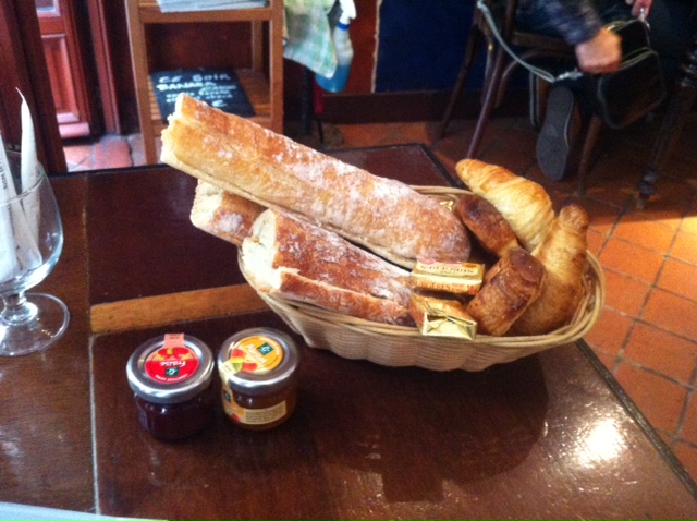 Un bon panier de pain frais avec des petites pâtisseries, beurre et confitures servies avec, accompagnés d’un yaourt nature et d’une salade de fruits frais.