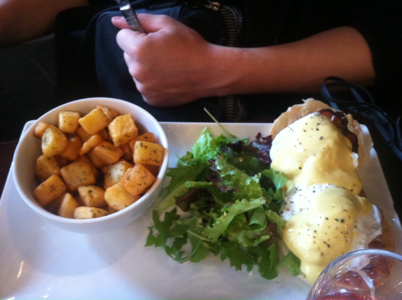 Mais, pour moi, il ne s’agit en rien d’un Brunch ! Le Frog propose des assiettes type egg benedicts accompagnés de petites pommes de terre sautées ( plutôt bonnes mais pas faites maison) et trois brins de salade. J’ai pris le Norway Eggs à base de saumon ( 13€) et Monsieur le Egg Benedict ( 12,50€). Ce n’est pas mauvais et ça cale plutôt bien. L’un de mes œufs pochés n’était pas réussi, et le muffin n’est pas toasté ce qui est un poil dommage.