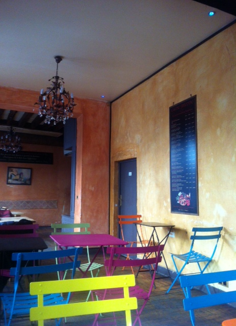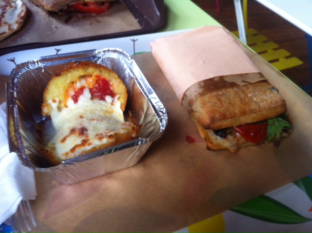 Je ne savais pas qu’il y avait une pièce à l’étage étage, et pourtant il y en a une, très grande, avec de superbes lustres au plafond, et des chaises colorées. Nous n’avons pas mangé de pizza cette fois-ci (mais je recommande notamment celle à la truffe), mais des Arrancini, des sandwichs toastés, et une sorte de calzone aux champignons et fromage. Tout est délicieux et frais. On en a eu pour une vingtaine d’euros. Les produits ne sont donc pas plus chers qu’ailleurs, et ils sont très très bons !