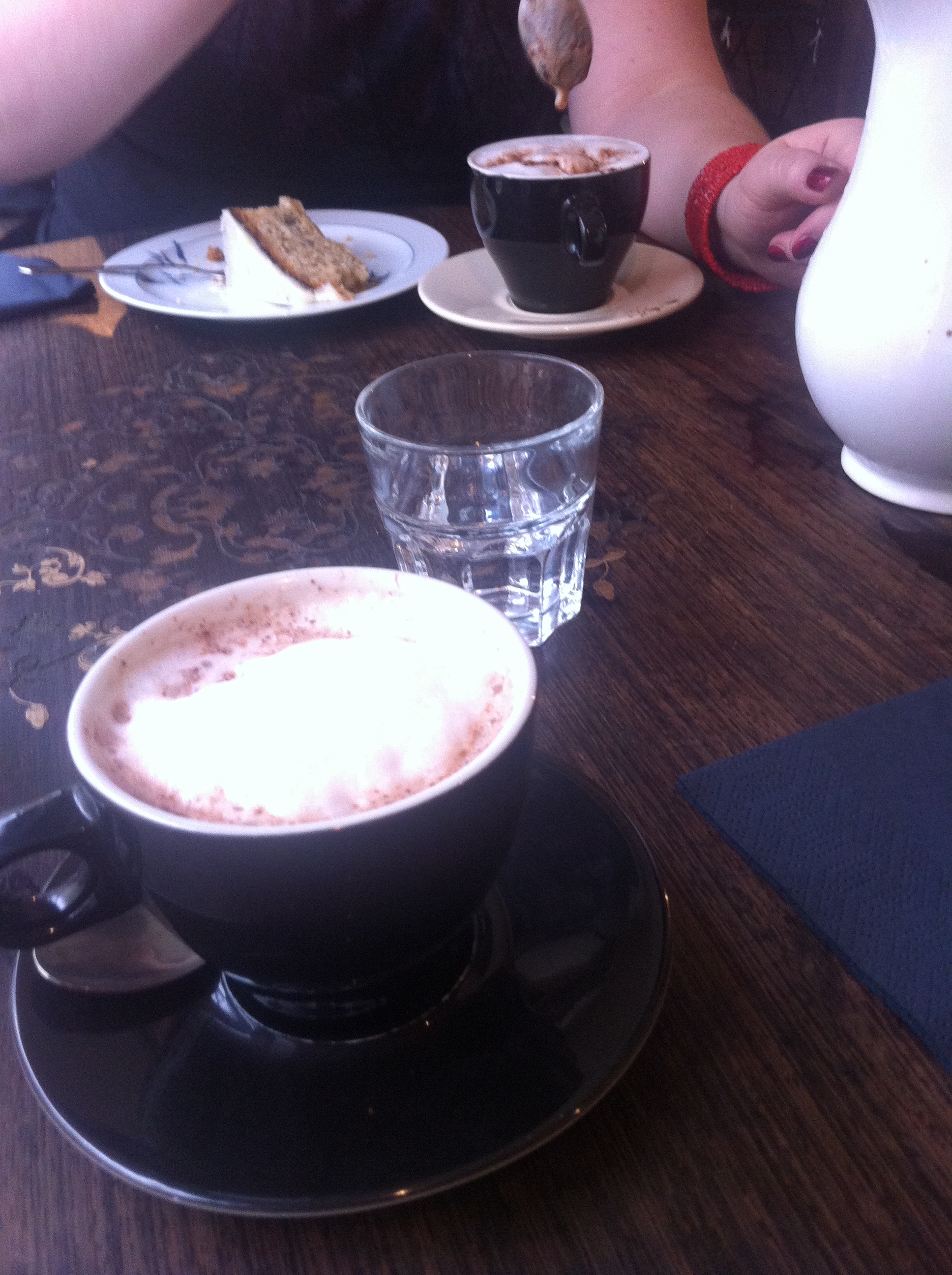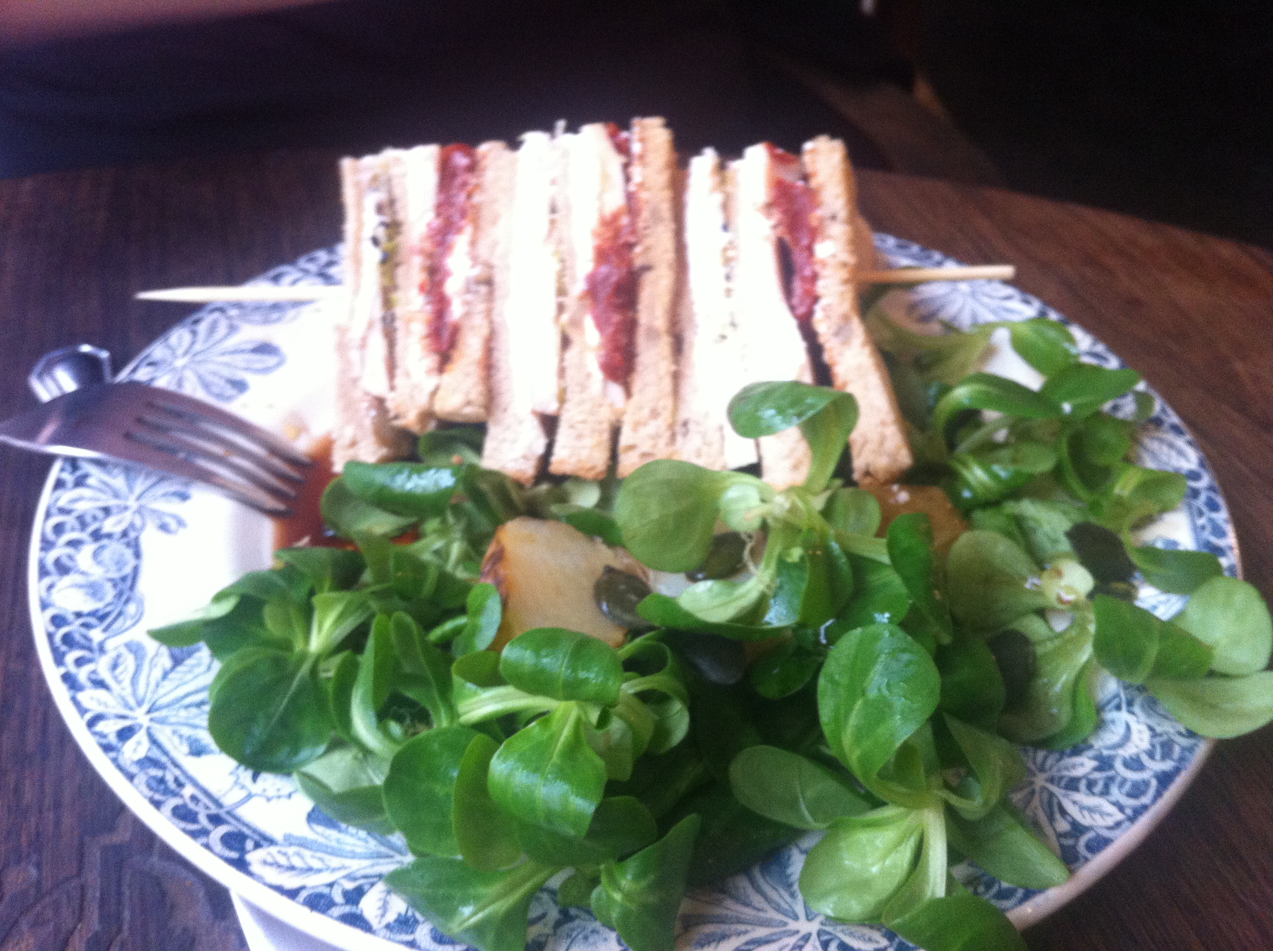 Parce que dans cet endroit, personne ne vous pousse à la roue. Il avait beau être comble comme nous sommes arrivées, nous avons vite eu une place très agréable, et de là, on nous a laissé profiter à notre aise de l’endroit. Mon amie a opté pour un club sandwich et un gâteau aux noix de pécan, je me contentais d’un lait vanille-gingembre délicieux et d’un chocolat non moins bon. Les prix sont très raisonnables ( de l’ordre de 3,5€ pour mes boissons). J’avais déjà déjeuné mais c’était fort dommage car j’aurais bien goûté à la carte, très appétissante.