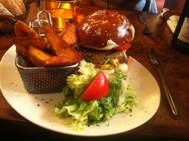 Alors, on mange quoi ? De la cuisine traditionnelle française, de la brasserie typique parisienne pour l’essentiel. Je ne dispose pas des photos mais deux convives se sont régalés d’un tartare de bœuf, une autre a opté raisonnablement pour un saumon sur lit d’épinards, tandis que je choisissais fiévreusement le burger végétal, pleine d’appréhension. A 16,70€ le burger, j’espérais quelque chose de copieux à tout le moins. Et … Quelle délicieuse surprise ! Un gros burger fait d’une galette croquante de légumes, et de tranches généreuses de mozzarella, accompagné d’une petite salade rafraîchissante et de bonne potatoes frites. Le bun est brun et plutôt bon, et mon tout remporte une mention bien. Ce n’est pas le meilleur burger que je n’ai jamais mangé mais il se situe tout de même en bonne place grâce à son l’originalité et son gout. Le burger végétarien remporte mes faveurs. Les autres convives ont également apprécié leurs plats avant …
