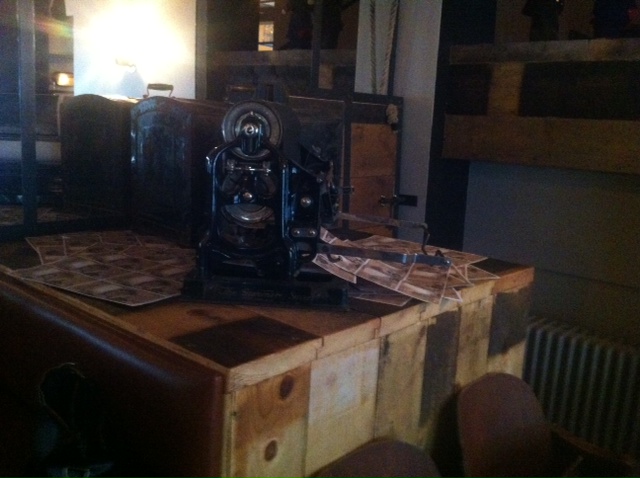Un samedi en fin d’après midi sur la Terre, je cherchais un bar dans le coin d’Opéra. Après m’être approchée de quelques enseignes hors de prix et sans intérêt Boulevard des Italiens, je me dirigeais vers le Passage Choiseul quand apparu La Planque qui proclamait que c’était l’Happy Hour ! Et comme j’avais très envie de passer une heure ou deux heureuses, je décidais de choisir ce lieu pour ce verre. Un Monsieur très poli et élégant m’accueillit à l’entrée. Dedans, j’étais seule au monde, absolument seule dans le décor d’un repère de faux monnayeur. Au plafond des liasses de billets de 500€, une machine à fabriquer les billets, des cartes en forme de Pascal ! Je me sentais immédiatement à l’aise dans cet endroit pour attendre la personne que j’avais conviée.