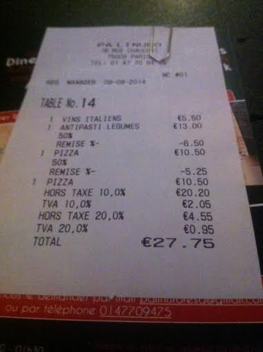 L’assiette de légumes était à 13€, nos pizzas à 10,5€. Ajoutons un verre de vin Italien à 5,50€. L’addition était déjà raisonnable. Avec la réduction de 50% sur l’assiette de légumes et l’une des pizzas, nous avons très bien mangé à deux pour moins de 28€.