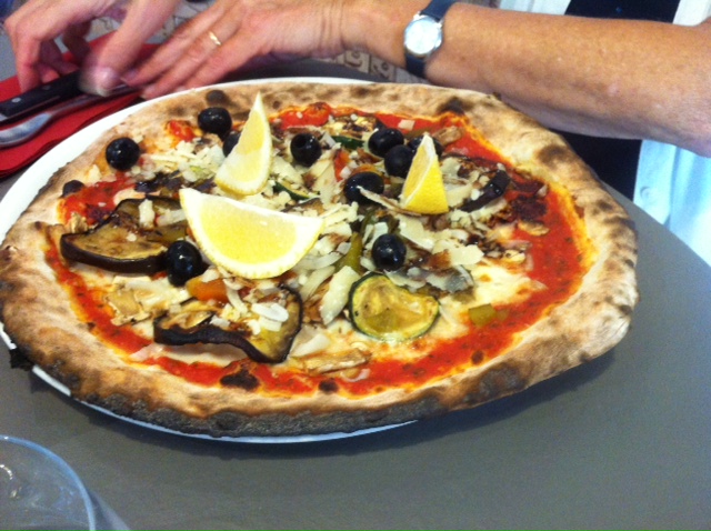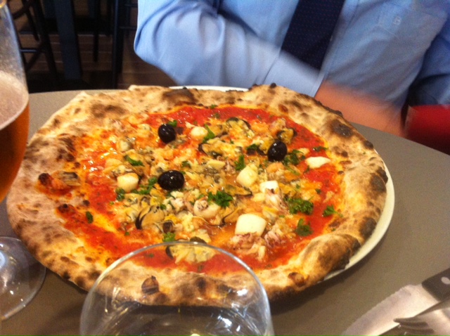 Cependant, elle faisait une bonne entrée en matière avant d’attaquer une pizza roquette, ricotta et miel ( 11€). Les premières bouchées sont très bonnes mais ça devient vite écœurant. La pâte est fine, ce n’est pas la plus savoureuse jamais testée mais elle se défend, et l’on peut facilement la finir car pas bourrative. Mes parents ont choisi une végétarienne, et une pizza aux fruits de mer.