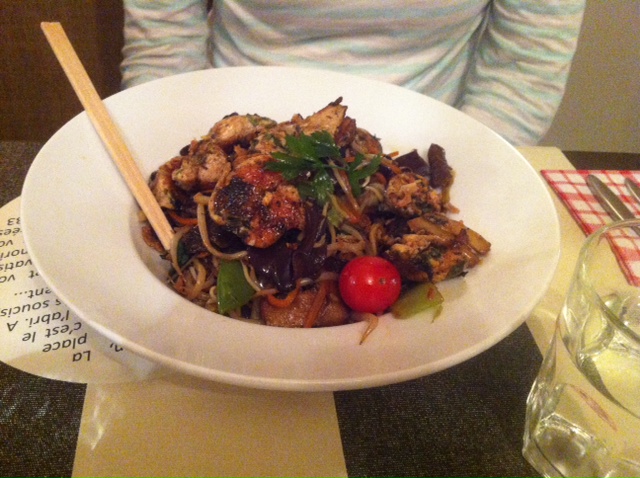 Ma copine a choisi le wok au poulet, copieux, bien garni et le poulet était particulièrement bien cuit. Pour l’avoir goûté ( hors poulet), je confirme qu’il est bon ( 15,5€). Il est servi avec quatre petites sauces.