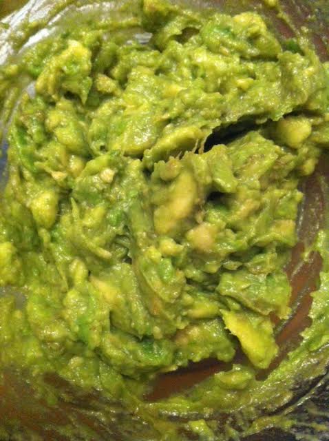 Etape 2 : Écraser les avocats dans un saladier. Arroser du jus d’un demi citron vert. Ajouter du sel et de l’huile d’olive (permet de lier la purée d’avocat mais non nécessaire car le produit est déjà gras). Couvrir d’un film plastique et laisser reposer au frais ( le moins longtemps possible pour ne pas lui laisser le temps de noircir)
