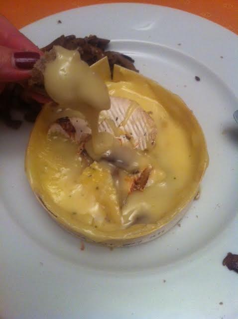 Étape 6 : Sortir les camemberts et retirer les piques en bois. Disposer sur une assiette avec le reste de la poêlée de champignons. Accompagner d’une salade verte. Prévoir du pain pour tremper dans le camembert fondu.