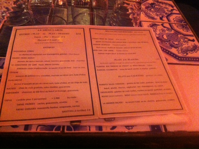 Me trouvant à Châtelet, je cherchais un restaurant dans le coin que je n’ai pas encore testé. Grâce à l’application « La fourchette », je trouvais « La Cucaracha » un restaurant mexicain devant lequel je suis passée des dizaines de fois sans jamais m’arrêter. Nous avons réservé pour 21h, et nous y sommes rendues avant l’heure, sans que l’on ne nous en tienne rigueur. La salle était aux 3/4 pleine à notre arrivée. La carte propose des menus à 23€, entrée-plat ou plat-dessert. Pour ajouter le dessert il vous en coûtera 4€ de plus.