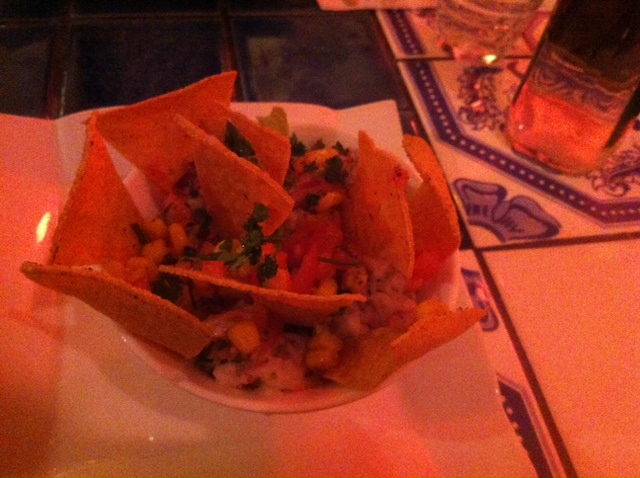 Comme nous venions de la Fourchette avec une réduction de 20% si nous prenions entrée et plat, ce système de menu ne m’a pas dérangée. Cependant, il arrive qu’un plat me suffise et je trouve cela un peu dommage de ne pouvoir sélectionner que cela. A la carte des entrées typiques, j’ai opté pour un ceviche de poisson et mon amie pour du guacamole. Le ceviche est mariné dans du citron vert, il faut avoir le palais bien accroché, le gout du citron est plutôt puissant ! Le guacamole est un régal.
