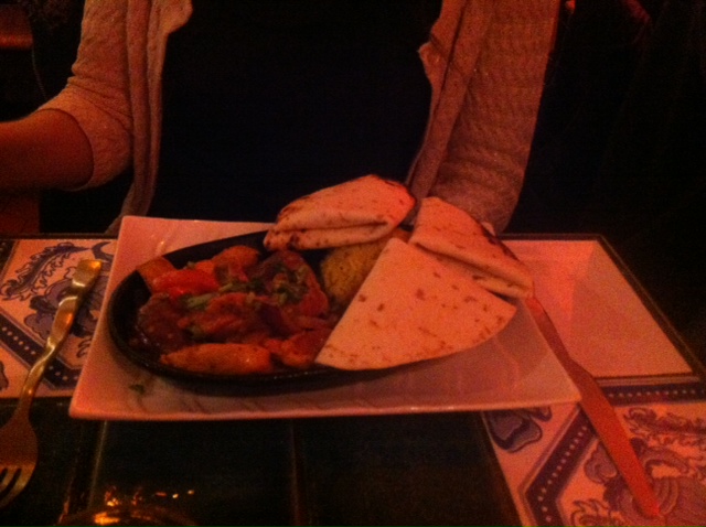 En plat j’ai opté pour un burrito végétarien au champignons (une version cactus existe aussi !). Servi avec une petite salade et du riz, je l’ai trouvé savoureux, et relativement copieux. Mon amie a choisi un plat avec supplément de 2€, la plancha aux émincés de poulet.