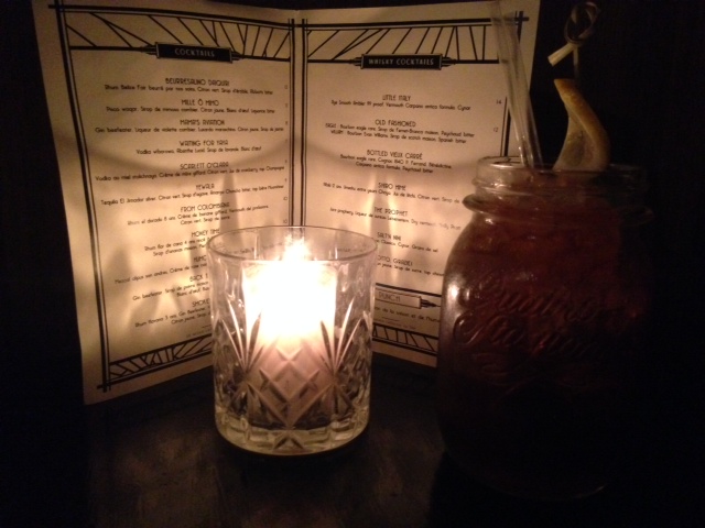 …Pour découvrir un univers totalement différent. Comme si nous venions de plonger dans un bar clandestin, caché derrière une pizzeria tout ce qu’il y a de plus classique. Après avoir poussé deux portes ( attention, dans la chambre froide, il fait froid !), nous nous retrouvons dans un fabuleux bar à cocktails aux lumières tamisées, ambiance lounge et barmans activant leur checker, nous voilà au Moonshiner ! L’amie qui me l’a fait découvrir m’explique que l’endroit, de plus en plus prisé, connait ses heures de gloire actuellement, et le monde en ce soir de semaine est là pour l’attester. Nous avons dégusté un cocktail Smoked Island (14€) et une pinte de bière ( 6€). Le temps a filé.