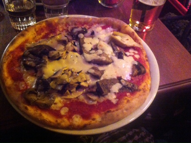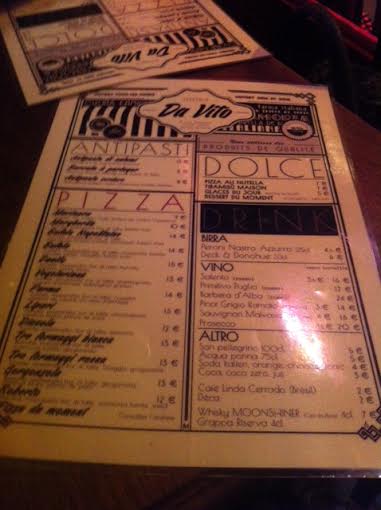 Puis deux places se sont libérées dans le restaurant, et nous sommes passées de l’autre côté du miroir. Cette fois-ci la carte est faite pour manger, et l’on ne sert que trois anti-pastis et des pizzas. J’ai choisi une pizza végétarienne (13€) et mon amie la pizza Parme (14€). Elles arrivent très rapidement, sont très appétissantes, et bien copieuses. Attention à leur sauce piquante si vous tenez à votre palais. Les pizzas sont vraiment bonnes, cuites au feu de bois, généreuses, agrémentées de bons produits, on en sort repus et ravis.