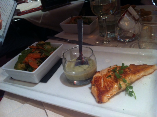 Maman a commandé en plat un saumon avec une sauce, à l’oseille semble-t-il, et des légumes revenus au wok. Elle a été satisfaite de son plat, ayant seulement déploré une sauce assez fade. Je ne l’ai pas goûté mais à l’œil il semblait tout de même un peu trop cuit ce poisson.