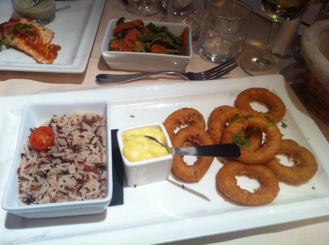 Mon père et moi avons opté pour le plat du jour, les beignets de calamar avec du riz (environ 13€). J’ai été déçue de ce plat. Je me suis vue servir des « beignets » de calamars comme il m’arrive de m’en faire parfois, quand je les sors du congélateur pour les passer 5 minutes à la poêle. Ils étaient, en plus d’être très industriels, trop cuits, et servis avec une sorte de sauce béarnaise d’un gout très neutre. Le riz était original, un mélange de riz blanc et de riz brun de bonne qualité mais servi sans le moindre assaisonnement qui suintait d’une tristesse désespérante.