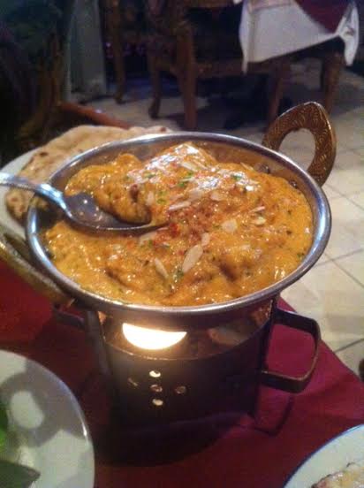 La carte est une carte de restaurant Indien avec ses entrées type Pakora de légumes ( aubergines, pommes de terre ..), oignons baja, Fish tikka etc … Nous avons choisi de partager un Pakora d’aubergines (4€) et une portion d’oignon bhaja (4€). Du déjà vu bien sur, mais plutôt bien exécuté, aucune mauvaise surprise.