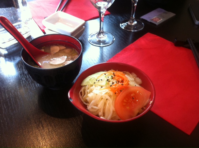 L’intérieur est très propre, et la décoration sobre se prête parfaitement à la détente. La carte propose un certain nombre de menus assez classiques. J’ai opté pour un menu à 12,50€ avec : soupe, salade, bol de riz, tempura de crevettes et beignets de légumes, complété de 8 californias maki saumon/avocat. Je suis sortie repue, à la limite de rouler. Question quantité, le test est parfaitement relevé, pour 12€50, on sort sans un petit creux ! Et question qualité ?