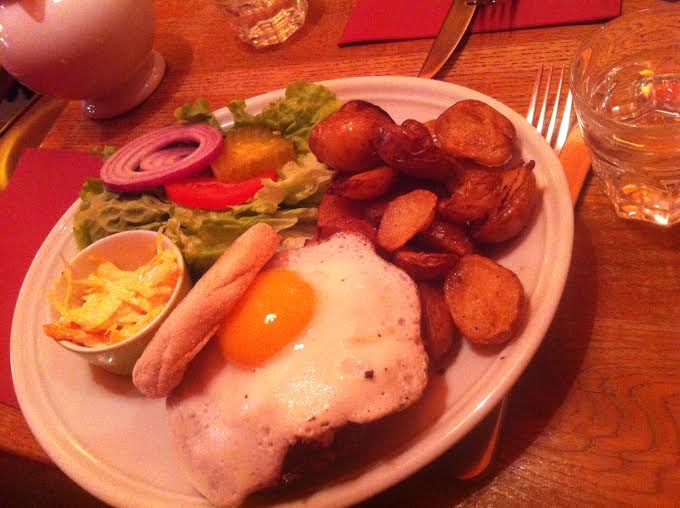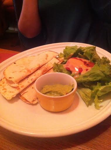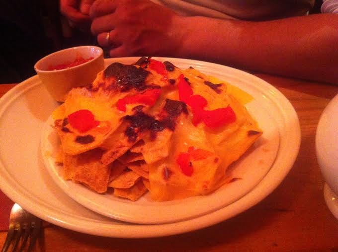On y mange principalement des burgers, c’est d’abord pour cela que les gens viennent. Puis quelques salades, des œufs type Bénédict et quelques entrées.Comme la réduction la Fourchette s’applique sur entrée + plat ou plat + dessert , nous avons tous choisi une entrée (qui sont au nombre de trois) : tapas ( oignon ring, stick de mozzarella et chicken wing à 7,50€), quesadillas (7,90) et nachos au fromage (7,90€). Tout est industriel bien entendu, mais cela ne nous a pas spécialement déplu : de la junk food en grosse portion pour commencer, et l’estomac n’en pouvait déjà.