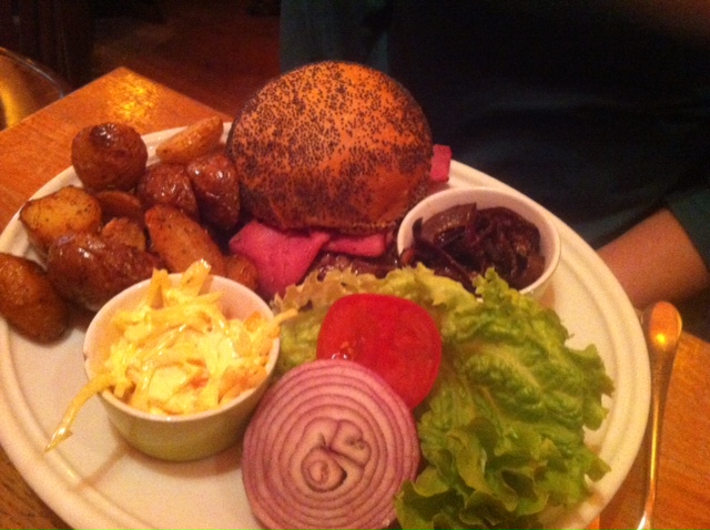 Pour les choses sérieuses mes trois testeurs certifiés ont choisi des burgers. Je n’ai pas opté pour la version veggie du burger car j’ai eu non seulement une crainte concernant le steak de cactus mais aussi sur la quantité car malgré une certaine satiété j’ai toujours du mal à m’arrêter …. J’optais pour les œufs norvégiens avec leurs pommes de terre grenaille (15,90€). Très bonne surprise, le saumon était très bon, les muffins comme il faut et les œufs parfaitement cuits. Mention bien à ces œufs.