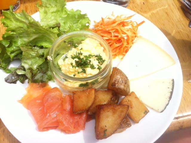 • La formule classique comprend une assiette ainsi composée : un pilon de poulet, du jambon, des pommes de terre grillées, des œufs brouillés et du coleslaw. Ne mangeant pas de viande, le patron a transformé mon assiette en y ajoutant une tranche de saumon, et deux tranches de fromage basques. Les pommes sautées sont d’ailleurs incroyables !