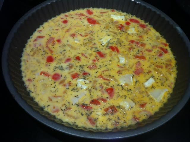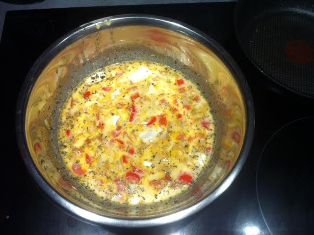 Ingrédients : 3 œufs / 125 g de farine / 25 cl de lait / une demi bûche de fromage de chèvre / un poivron / un oignon jaune / des herbes de Provence / de l’huile d’olive / sel et poivre
