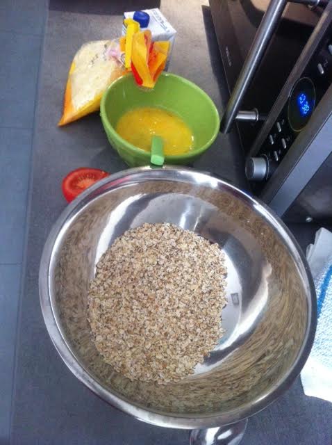 2- Mélanger les œufs avec une cuillère à soupe d’eau. Incorporer une pincée de fromage râpé. Ajouter cette préparation aux flocons d’avoine. Verser la crème de soja et mélanger. Réserver la préparation.
