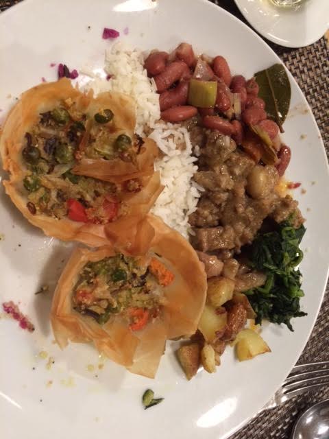 3  5 4Après la première assiette, j’avais le ventre bien tendu, mais comptais faire honneur au buffet chaud qui comprend une soupe ( courgette ce soir là), une préparation de seitan aux morilles à tomber, des pastéis aux légumes … un vrai régal. Même mon copain pour qui c’était le premier restaurant végétarien s’est fait un plaisir de ce repas.