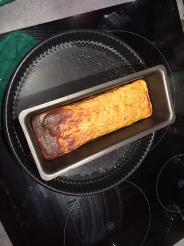 4- Huiler un moule à cake, y verser le mélange. Mettre au four 20 min à 200 degrés.