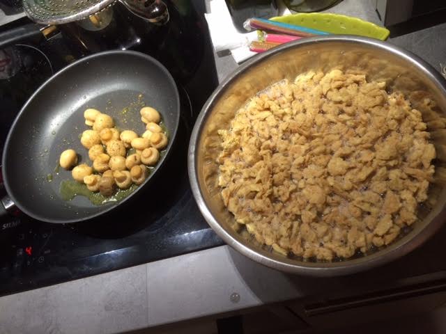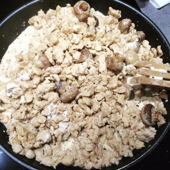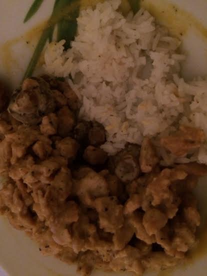 Ingrédients : 250 gr de protéine de soja, des champignons, du lait d’amandes, du lait de coco, de la sauce soja salé, curry, cumin, sel et poivre.