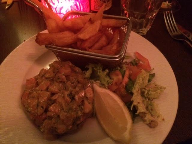 Nous avons tous opté pour un plat et un dessert. Sont arrivés sur la table deux grosses salades, un magret de canard et un tartare de saumon et ses frites maison. Si le magret a légèrement déçu, les salades étaient à la hauteur. J’ai du manger vite mais mon tartare de saumon était plutôt bien assaisonné et les frites délicieuses.