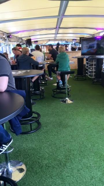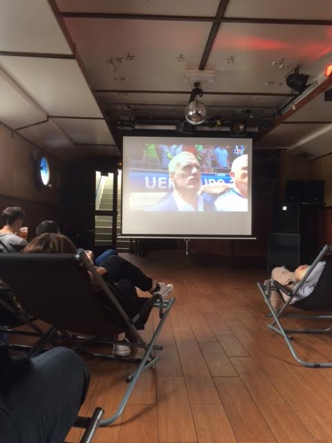 Le Bargee Football Club est une péniche éphémère, où l’on vous propose de regarder les matchs de l’Euro 2016, tout en sirotant un choix de boissons avec ou sans alcool. En haut, deux TV, des tables hautes. En bas, une cale de bateau avec des transats et une toile géante. C’est là, dans une bonne ambiance malgré quelques problèmes techniques, que nous avons vu la France gagner péniblement sa place en quart de finale. Quoi de mieux que de profiter du soleil tout en regardant les matchs avec des amis et quelques inconnus?