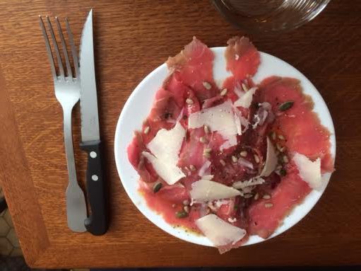 L’entrée de Monsieur, le Carpaccio de bœuf, a été un franc succès. Tout comme ma salade végétarienne et sa farandole de légumes de saison et de graines. J’ai beaucoup aimé la fraîcheur de la salade (poivron, champignon, avocat …), et le croquant des graines.